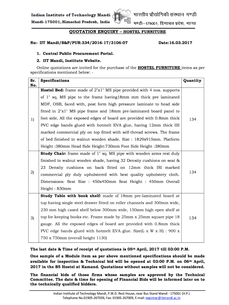 QUOTATION Inquiry HOSTEL FURNITURE No: IIT Mandy/S&P/PUR334/201617/310607Date:16.03.20171. Central Public Procurement Portal. 2. IIT Mandy, Institute Website. Online quotations are invited for the