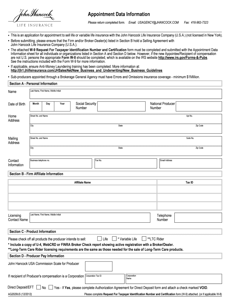 You must submit a completed W-9 form for tax identification purposes along with the John Hancock Appointment Data Information Form.