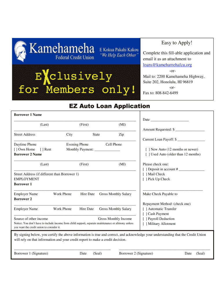 The EZ Auto Loan Application is a financial document used by individuals to apply for an auto loan from Kamehameha Federal Credit Union.