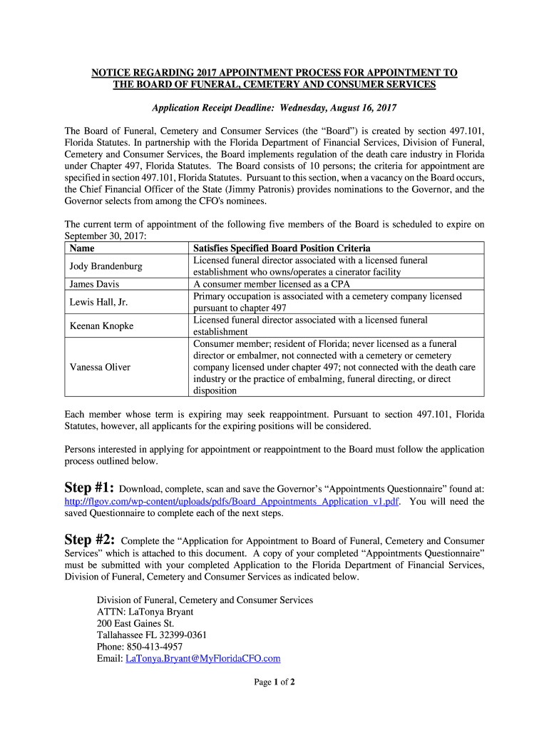 NOTICE REGARDING 2017 APPOINTMENT PROCESS FOR APPOINTMENT TO