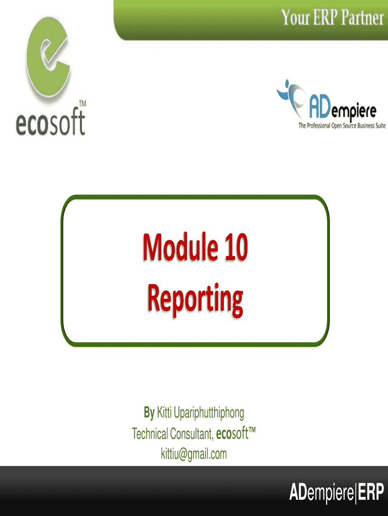 Module 10 Reporting By Kitty Upariphutthiphong Technical Consultant, ECOSOC kitten Gmail.comADempiere ERP 1Module Objectives Type of Reports in Empire Report Architecture Integration with Jasper Report
