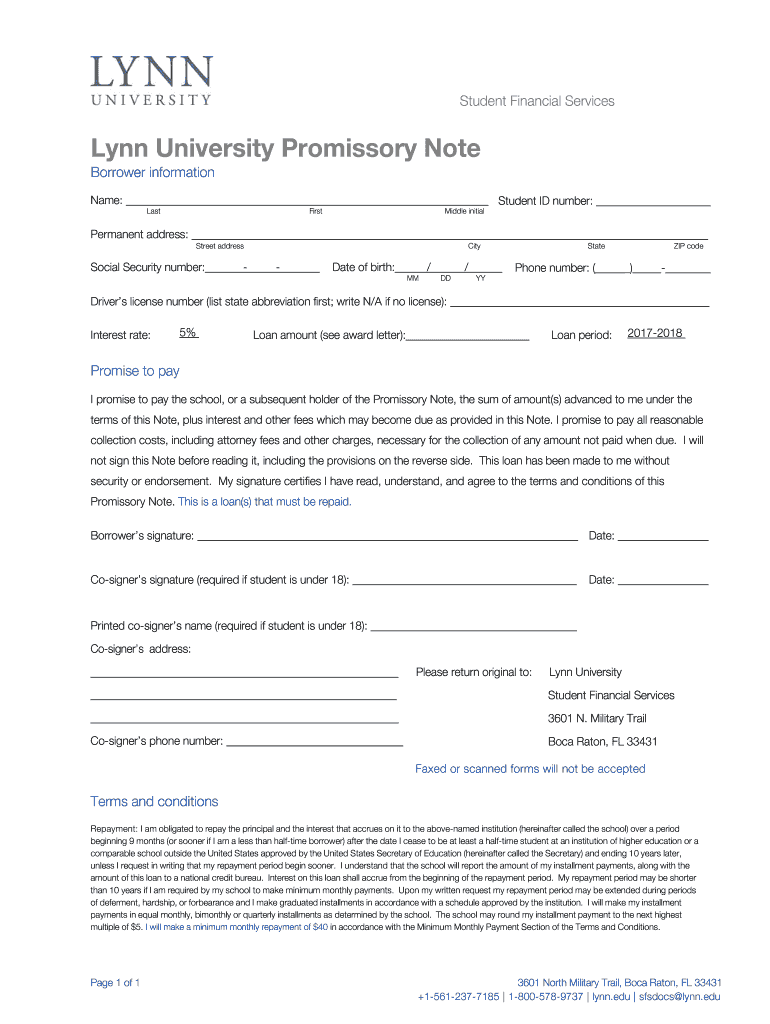Student Financial Services Lynn University Promissory Note Borrower information Name:LastFirstMiddle initialStudent ID number:Permanent address: Street addressSocial Security number:City Date of birth: