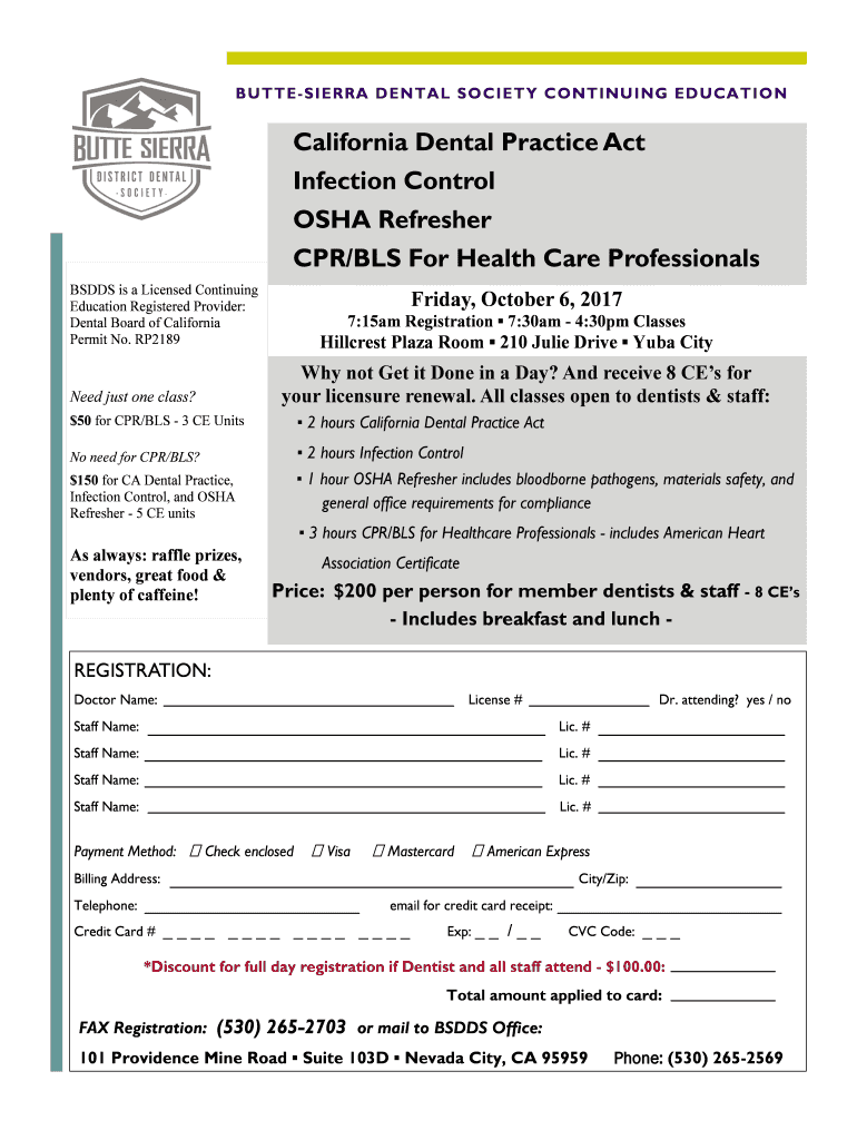 Dental professionals who are members of Butte-Sierra Dental Society are required to file for the continuing education program.