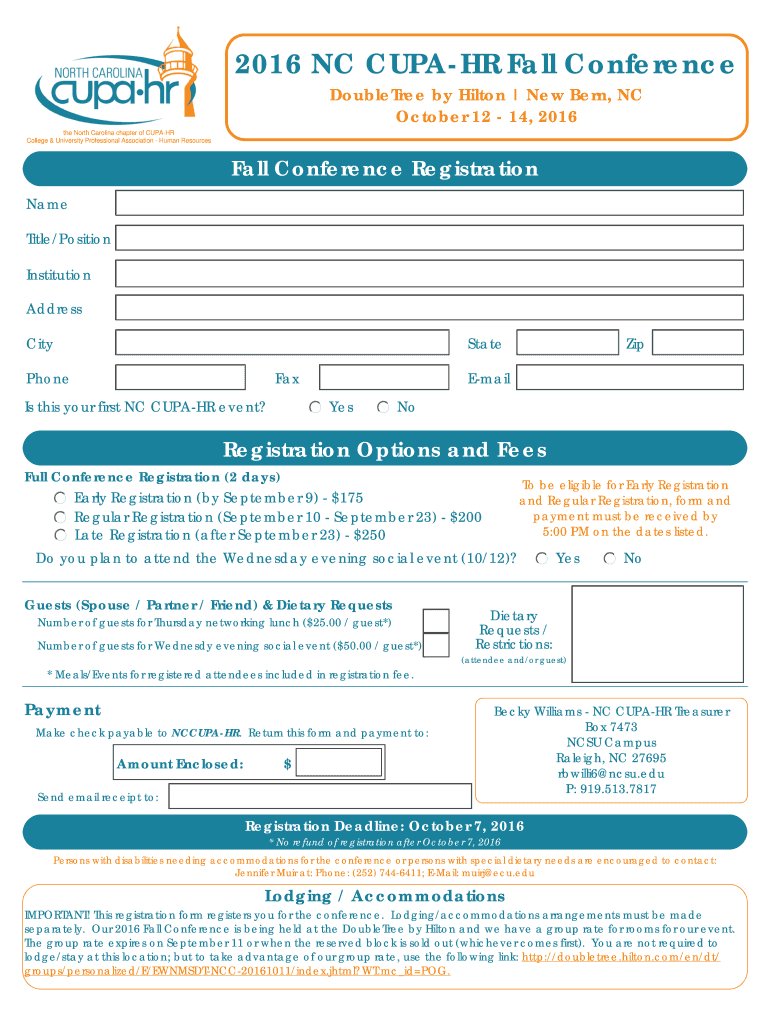 2016 NC CUP AHR Fall Conference Doublet by Hilton New Bern, NC October 12 14, 2016the North Carolina chapter of CUP AHR College & University Professional Association Human Resourceful Conference Registration