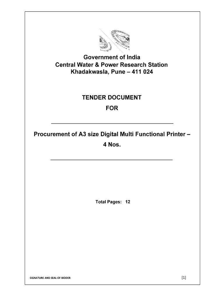 Government of India Central Water & Power Research Station Khadakwasla, Pune 411 024TENDER DOCUMENT FOR Procurement of A3 size Digital Multi Functional Printer 4 Nos. Total Pages: 12SIGNATURE AND