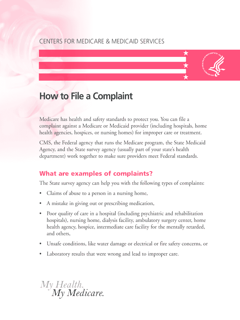 CENTERS FOR MEDICARE & MEDICAID SERVICES How to File a Complaint Medicare has health and safety standards to protect you. You can file a complaint against a Medicare or Medicaid provider (including
