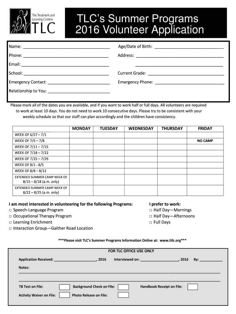 TLC's Summer Programs 2016 Volunteer Application Name: Age/Date of Birth: Phone: Address: Email: School: Current Grade: Emergency Contact: Emergency Phone: Relationship to You: Please mark all the