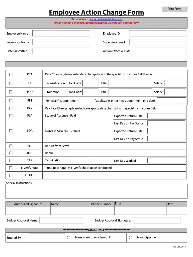 6 Jan 2014 ... Employee Action Change Form. Employee ID. Action Effective Date. Employee Name. Supervisor Email. Supervisor Name. PAY. Pay Rate ...