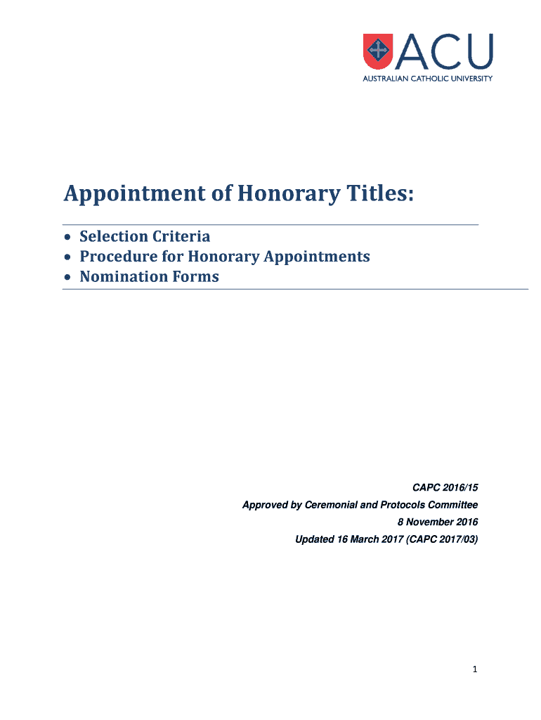 Appointment of Honorary Titles: Selection Criteria Procedure for Honorary Appointments Nomination Formulaic 2016/15 Approved by Ceremonial and Protocols Committee 8 November 2016 Updated 16 March