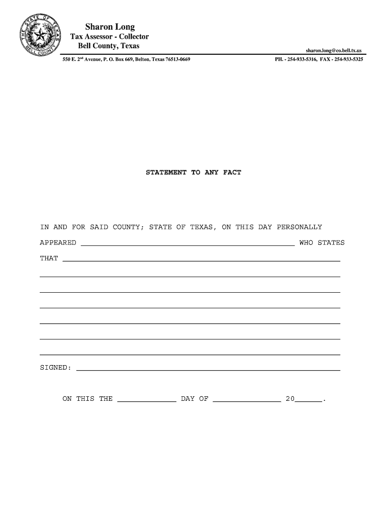 The Texas Affidavit Form is a legal document used by individuals in Bell County, Texas, to make a sworn statement under penalty of perjury.