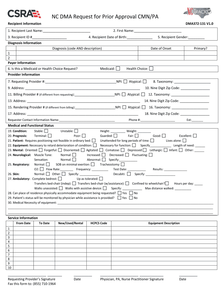 NC MA Request for Prior to Approval CAN/PA Recipient InformationDMA372131 V1.01. Recipient Last Name: 3. Recipient ID # 2. First Name: 4. Recipient Date of Birth: 5. Recipient Gender: Diagnosis Information