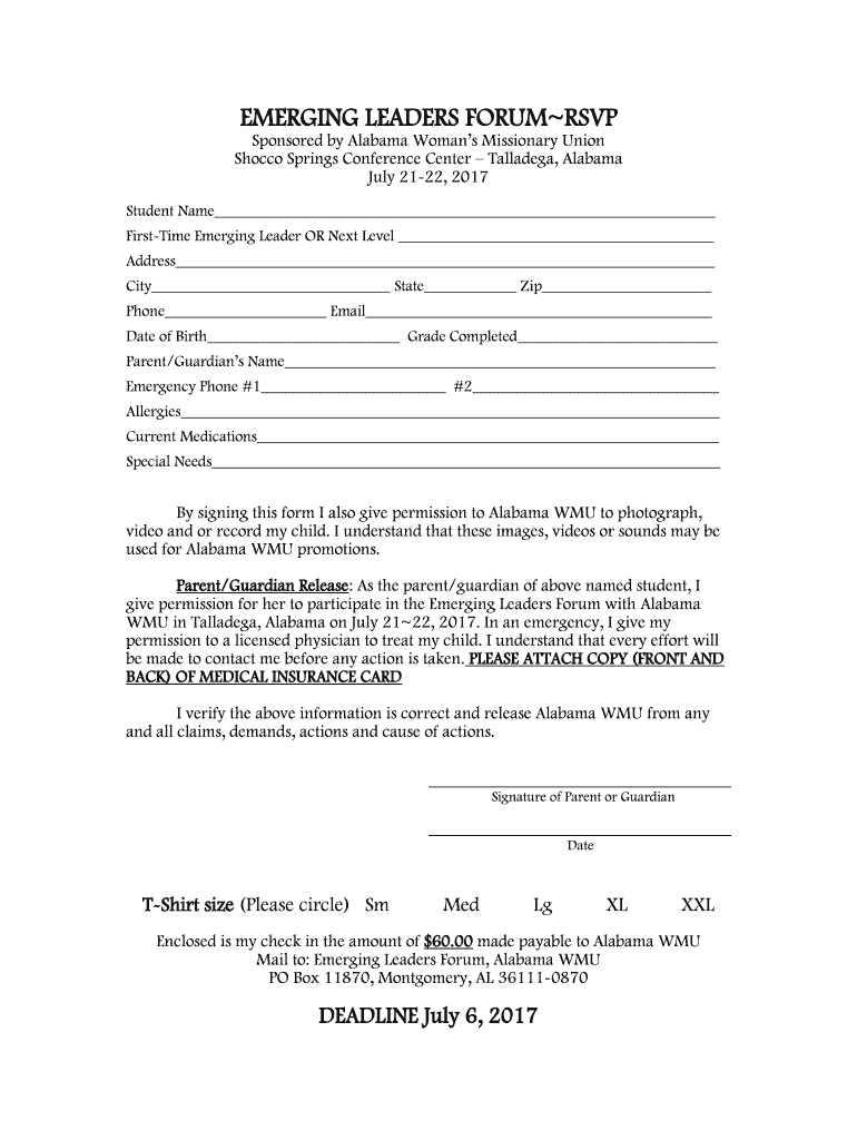 EMERGING LEADERS FORUM RSVP Sponsored by Alabama Women Missionary Union Shock Springs Conference Center Balladeer, Alabama July 2122, 2017 Student Name First-time Emerging Leader OR Next Level Address