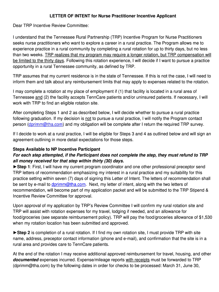 LETTER OF INTENT for Nurse Practitioner Incentive Applicant