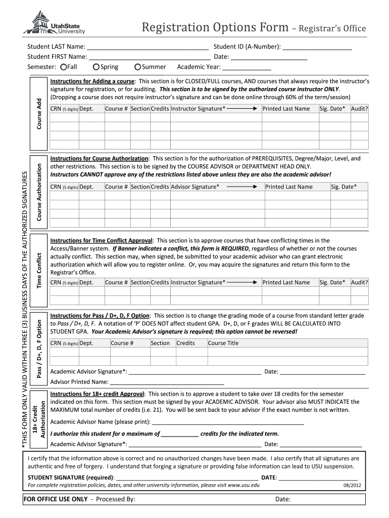 The Student Registration Options Form serves as a critical tool for students at Utah State University (USU) to manage their registration effectively. This form enables students to request various academic adjustments such as adding closed courses, changing grading modes, and resolving time conflicts.