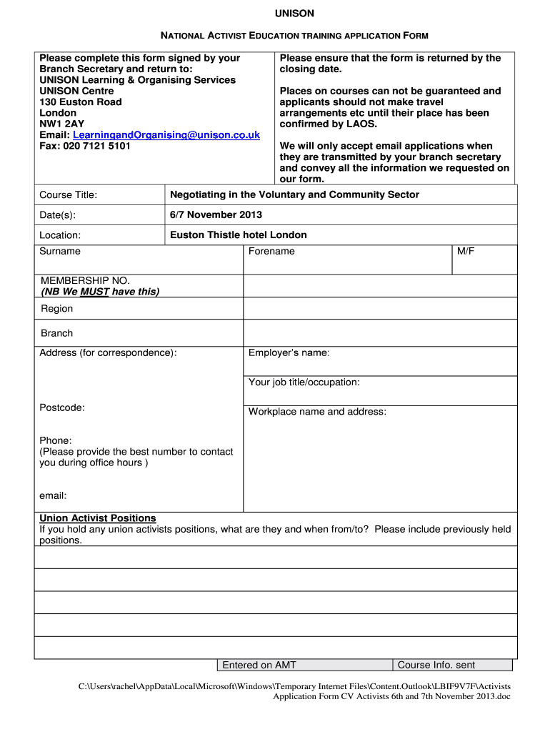 UNISON NATIONAL ACTIVIST EDUCATION TRAINING APPLICATION FORM Please complete this form signed by your Branch Secretary and return to: UNISON Learning & Organizing Services UNISON Center 130 Huston