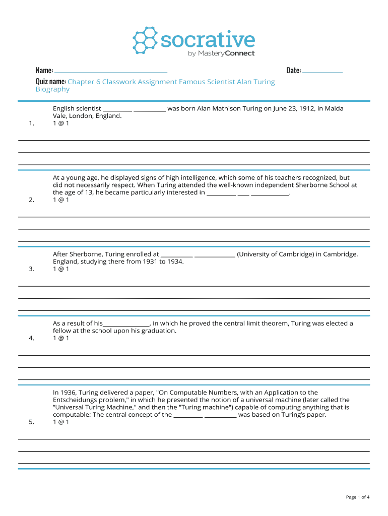 Get the free Quiz name: Chapter 6 Classwork Assignment Famous Scientist Alan Turing