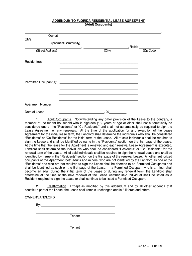 ADDENDUM TO FLORIDA RESIDENTIAL LEASE AGREEMENT (Adult Occupants), (Owner) d/b/a (Apartment Community), Florida (Street Address) (City) (Zip Code)Resident(s):Permitted Occupant(s):Apartment Number: