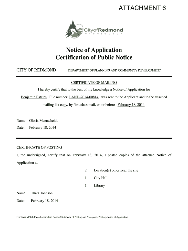 CITY OF REDMONDDEPARTMENT OF PLANNING AND COMMUNITY DEVELOPMENTCERTIFICATE OF MAILING
