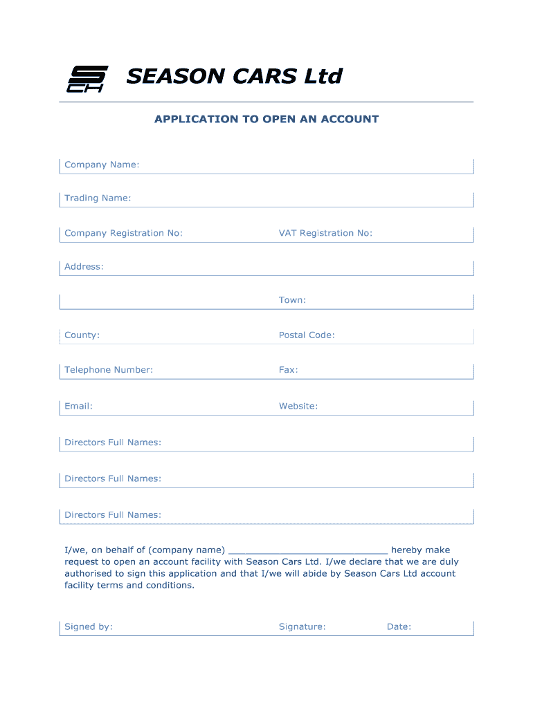 SEASON CARS Ltd APPLICATION TO OPEN AN ACCOUNT Company Name: Trading Name: Company Registration No: VAT Registration No: Address: Town: County: Postal Code: Telephone Number: Fax: Email: Website: