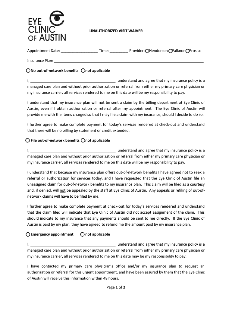 It is advisable to complete the Unauthorized Visit Waiver before your visit to the Eye Clinic of Austin. Ensure it is signed and submitted during your appointment to avoid disruptions in service.
