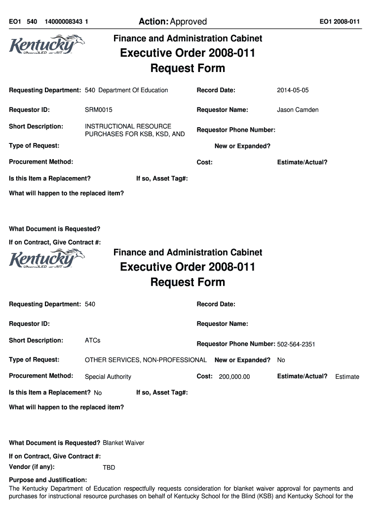 EO1 540Action: Approved14000008343 1EO1 2008011Finance and Administration CabinetExecutive Order 2008011