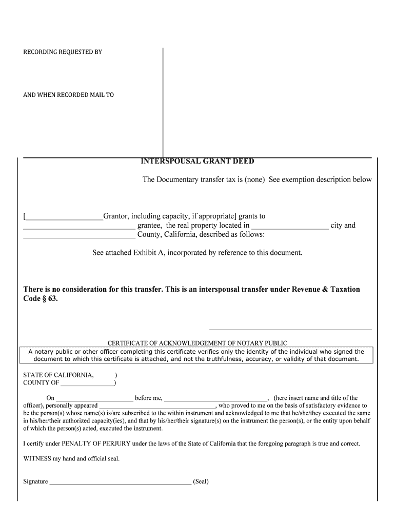 To achieve exemption from the documentary transfer tax, make sure to refer to California Revenue & Taxation Code § 63 and clearly indicate that the transfer is between spouses within the document.