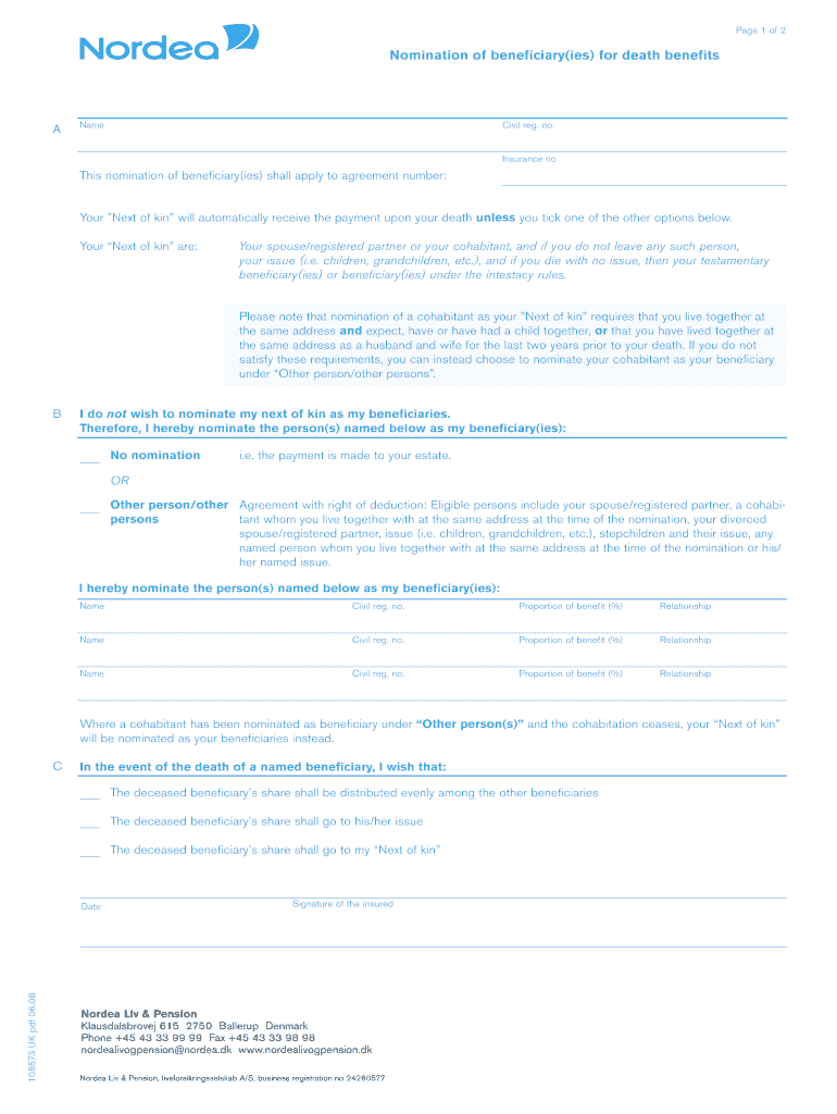 Page 1 of 2Nomination of beneficiary(IES) for death benefitsANameCivil reg. No.