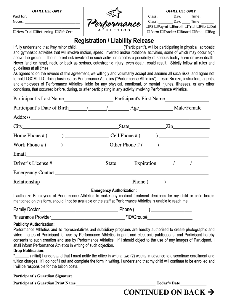 OFFICE USE ONLY Paid for: Notes: New Trial Returning Gift CertOFFICE USE ONLY Class: Day: Time: Class: Day: Time: PS Pay CT Enroll Trial File Dot Form Tracker Board Email Registration / Liability