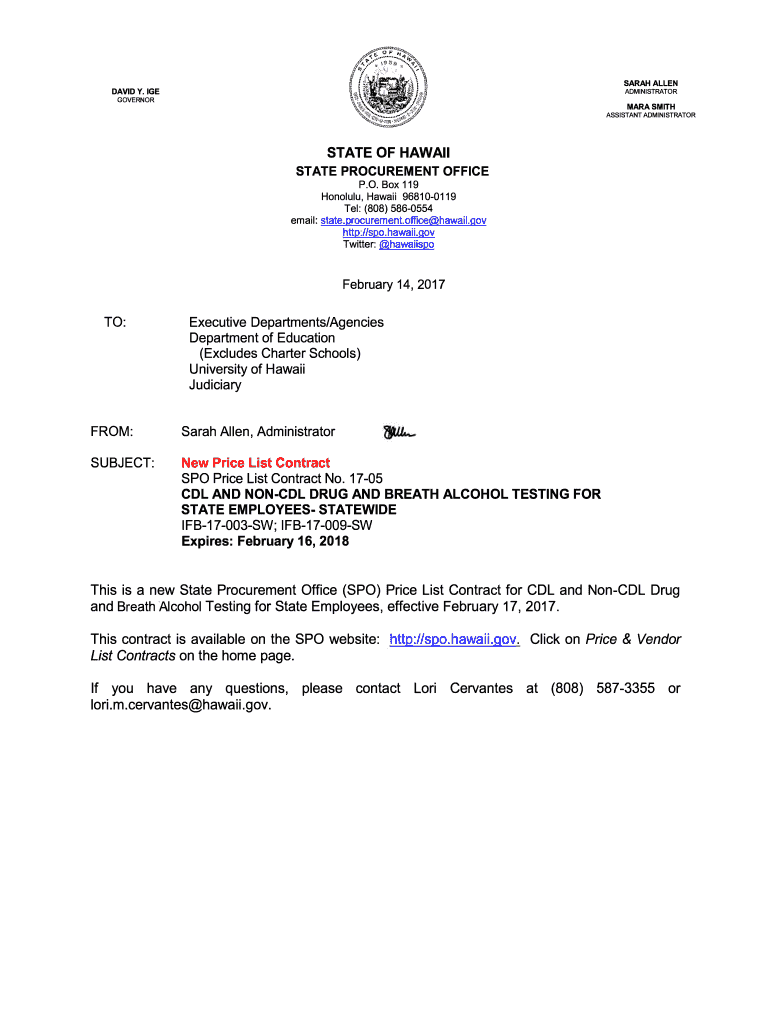 SARAH ALLEN ADMINISTRATORDAVIDY. IGE GOVERNORATE SMITH ASSISTANT ADMINISTRATORSTATE OF HAWAII STATE PROCUREMENT OFFICE. O. Box 119 Honolulu, Hawaii 968100119 Tel: (808) 5860554 email: state.procurement.office