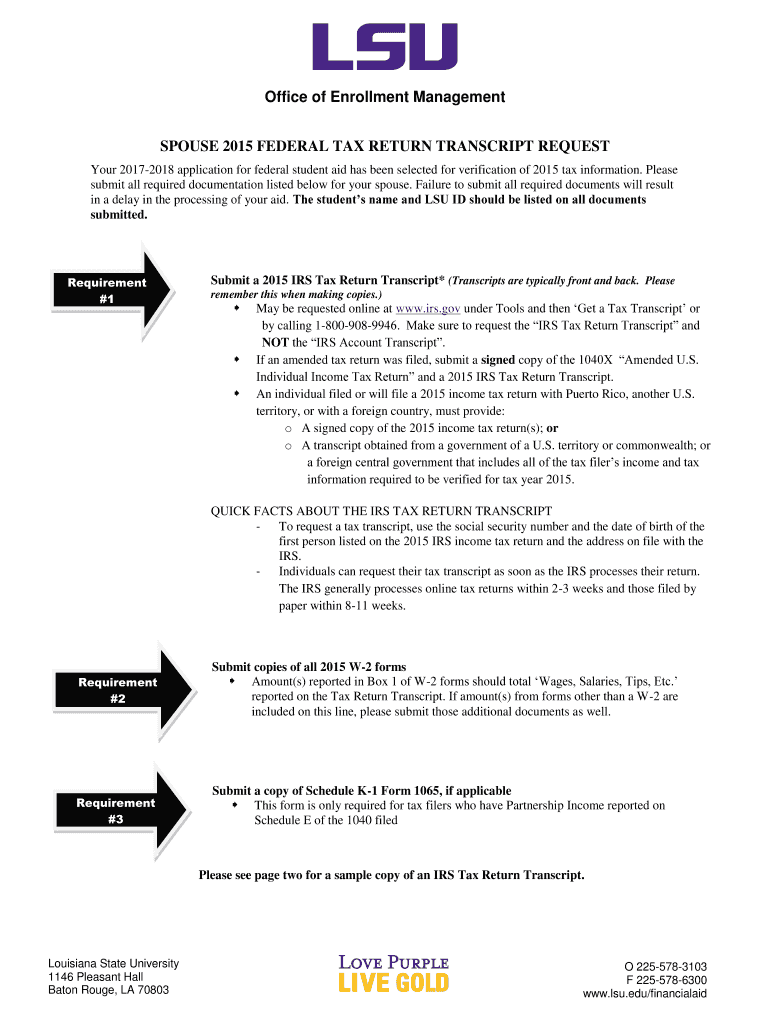 SPOUSE 2015 FEDERAL TAX RETURN TRANSCRIPT REQUEST