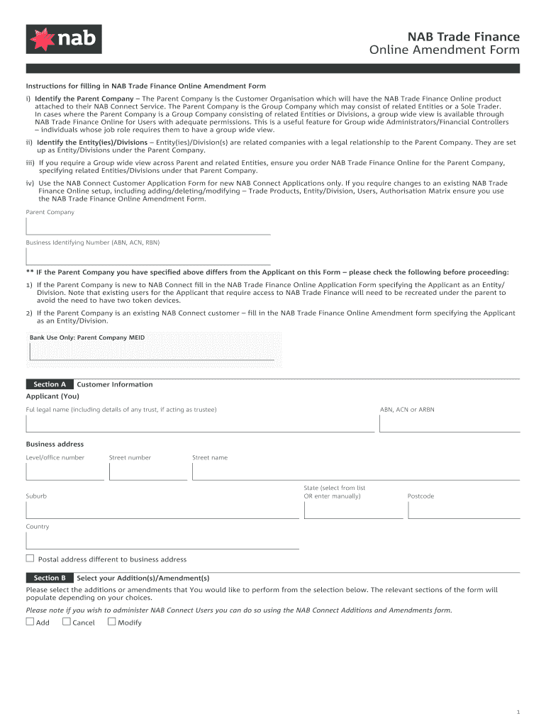 NAB Trade Finance Online Amendment Form Instructions for filling in NAB Trade Finance Online Amendment Form i) identify the Parent Company The Parent Company is the Customer Organization which will