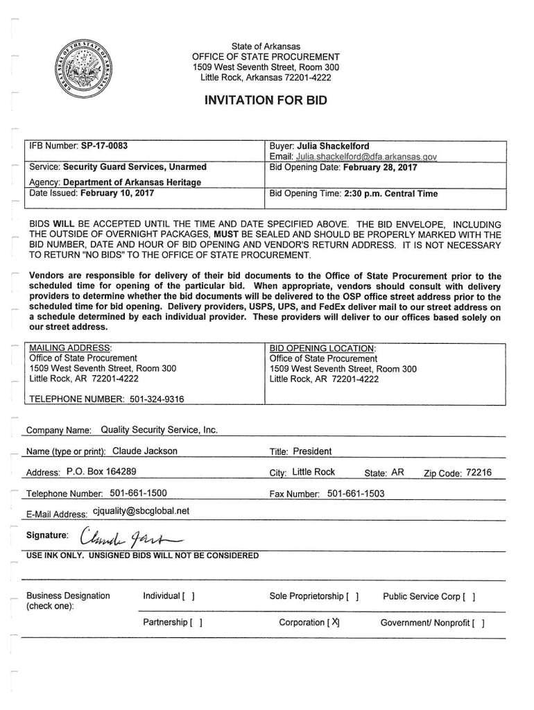 State of Arkansas OFFICE OF STATE PROCUREMENT 1509 West Seventh Street, Room 300 Little Rock, Arkansas 722014222INVITATION FOR BIDING Number: SP170083 Service: Security Guard Services, UnarmedBuyer: