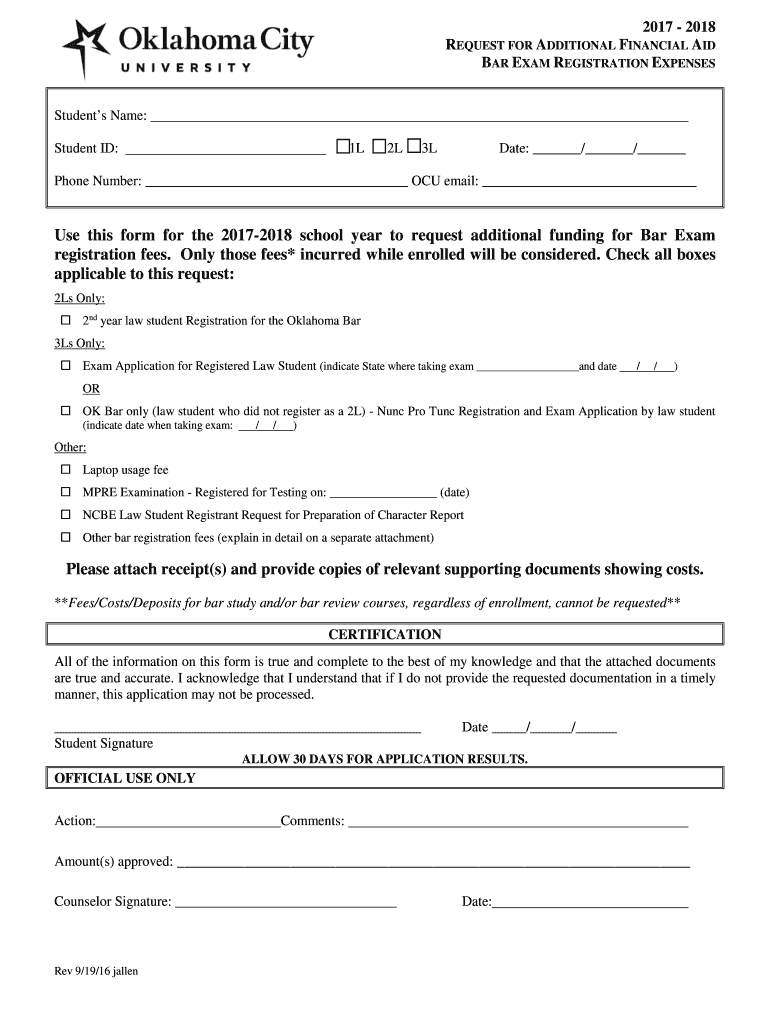 2017 2018 REQUEST FOR ADDITIONAL FINANCIAL AID BAR EXAM REGISTRATION EXPENSESStudents Name: 1L 2L 3LStudent ID:Date: / / Phone Number: ICU email: Use this form for the 20172018 school year to request