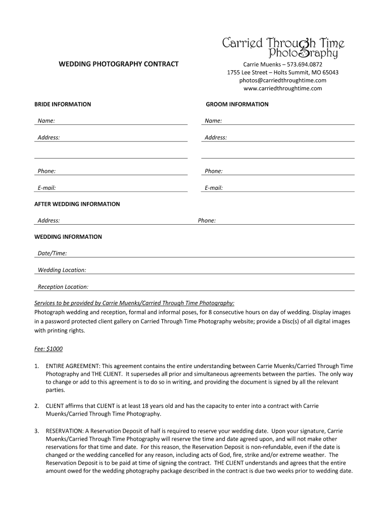 WEDDING PHOTOGRAPHY CONTRACTILE INFORMATION Carrie Monks 573.694.0872 1755 Lee Street Holt's Summit, MO 65043 photos carriedthroughtime.com www.carriedthroughtime.com GROOM Informational:Name:Address:Address:Phone:Phone:Email:Email:AFTER