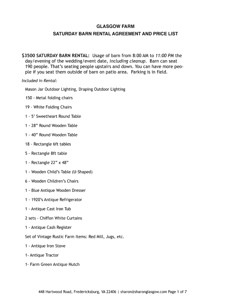 GLASGOW FARM !! !SATURDAY BARN RENTAL AGREEMENT AND PRICE LIST!$3500 SATURDAY BARN RENTAL: Usage of barn from 8:00 AM to 11:00 PM the day/evening of the wedding/event date, including cleanup. Barn