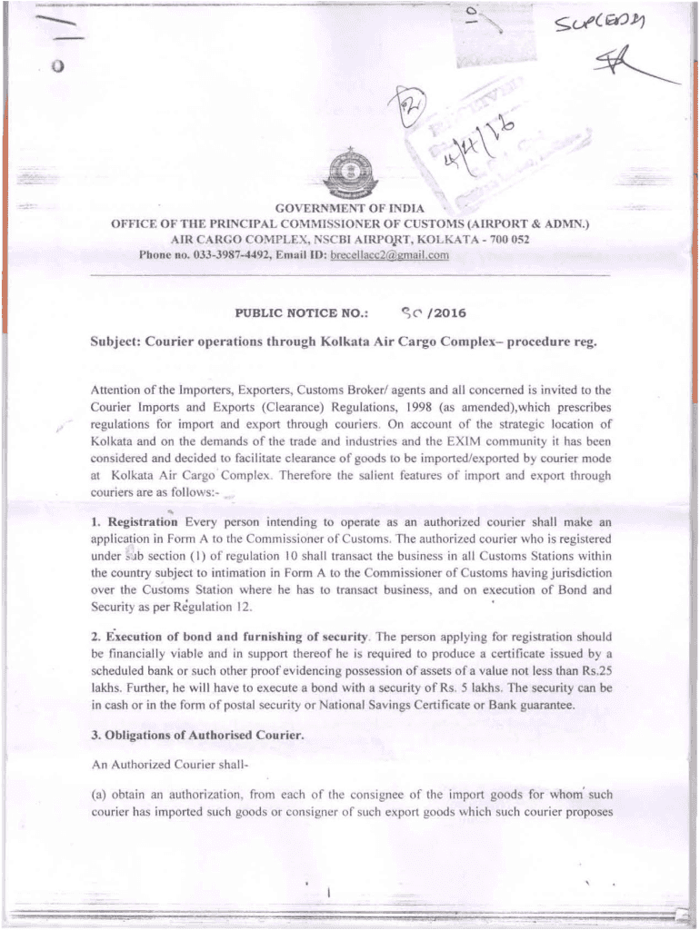 , c, ',5.(/(0011019. “IX:GOVERNMENT OF INDIA OFFICE THE PRINCIPAL COMMISSIONER OF CUSTOMS (AIRPORT & ADEN, ) Am CARGO COMPLEX, I 'SCSI All 'On, KOLKATA 700 052 Phone 110. 03339874 '92, Email lo