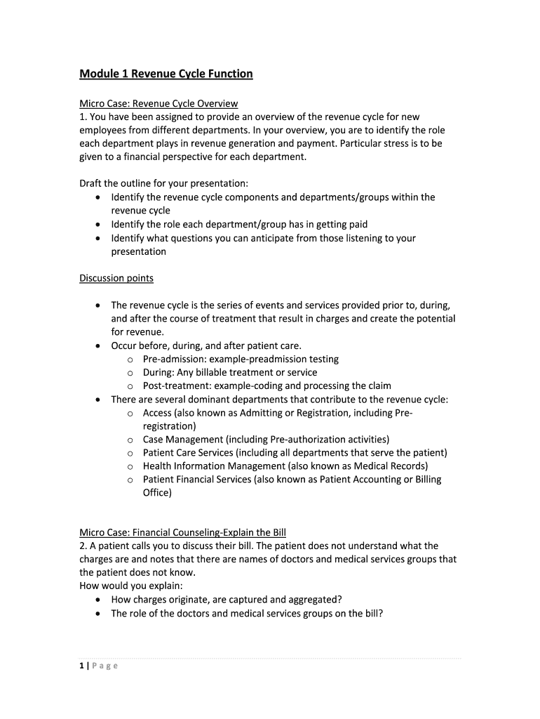 Module1RevenueCycleFunction MicroCase:RevenueCycleOverview 1. Youhavebeenassignedtoprovideanoverviewoftherevenuecyclefornew employeesfromdifferentdepartments. Inyouroverview, youaretoidentifytherole