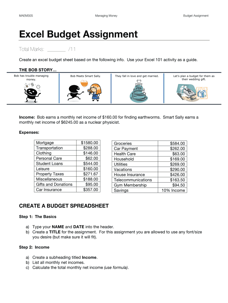 MAEM30SManaging MoneyBudget AssignmentExcel Budget Assignment Total Marks: /11 Create an Excel budget sheet based on the following info. Use your Excel 101 activity as a guide. THE BOB STORY Bob has