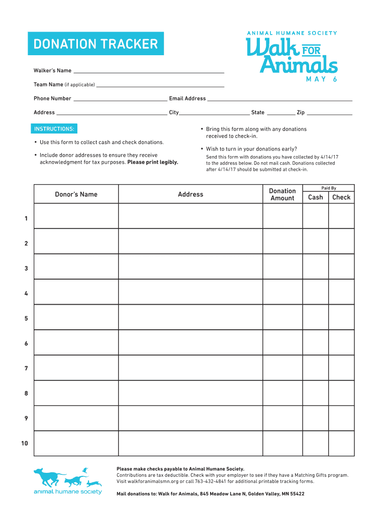DONATION TRACKER Walkers Name Team Name (if applicable) Phone Number Email Address City State Zip INSTRUCTIONS: Bring this form along with any donations received to check in. Use this form to collect