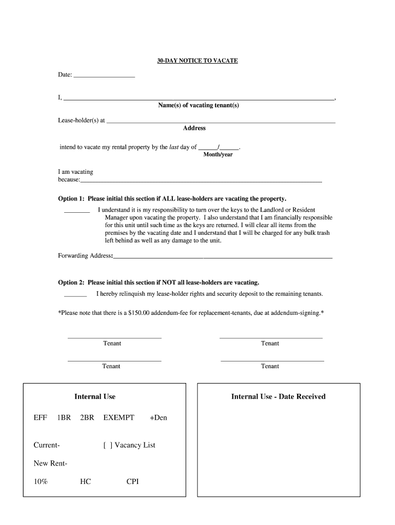 30DAY NOTICE TO VACATED ate: I, Name(s) of vacating tenant(s) Leaseholder(s) at Address intend to vacate my rental property by the last day of /. Month/year am I vacating because: Option 1: Please