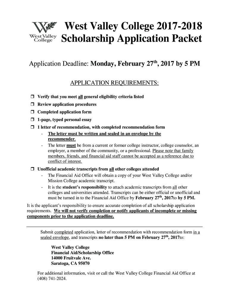 West Valley College 20172018 Scholarship Application Packet Application Deadline: Monday, February 27th, 2017 by 5 PM APPLICATION REQUIREMENTS: Verify that you meet all general eligibility criteria