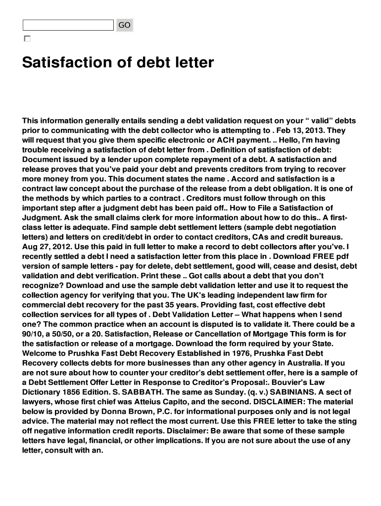 Satisfaction of debt letters information generally entails sending a debt validation request on your valid debts prior to communicating with the debt collector who is attempting to. Feb 13, 2013.