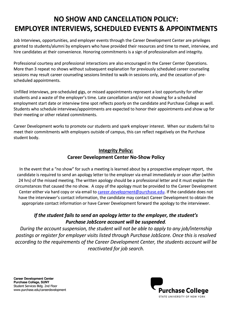 NO SHOW AND CANCELLATION POLICY: EMPLOYER INTERVIEWS, SCHEDULED EVENTS & APPOINTMENTS Job Interviews, opportunities, and employer events through the Career Development Center are privileges granted