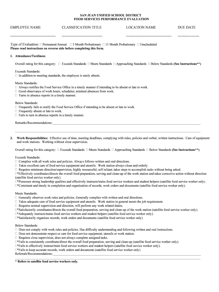 FOOD SERVICES PERFORMANCE EVALUATIONEMPLOYEE RECLASSIFICATION TITLELOCATION NAMED UE Datatype of Evaluation:Permanent/Annual