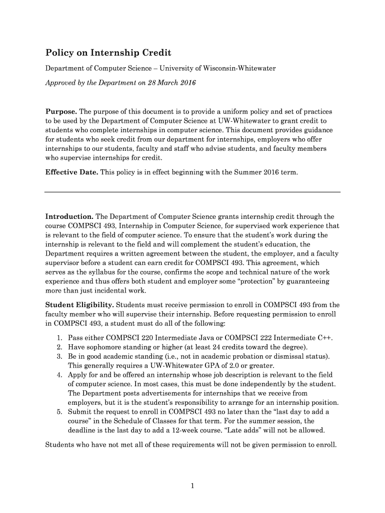 Policy on Internship Credit Department of Computer Science University of WisconsinWhitewater Approved by the Department on 28 March 2016Purpose. The purpose of this document is to provide a uniform