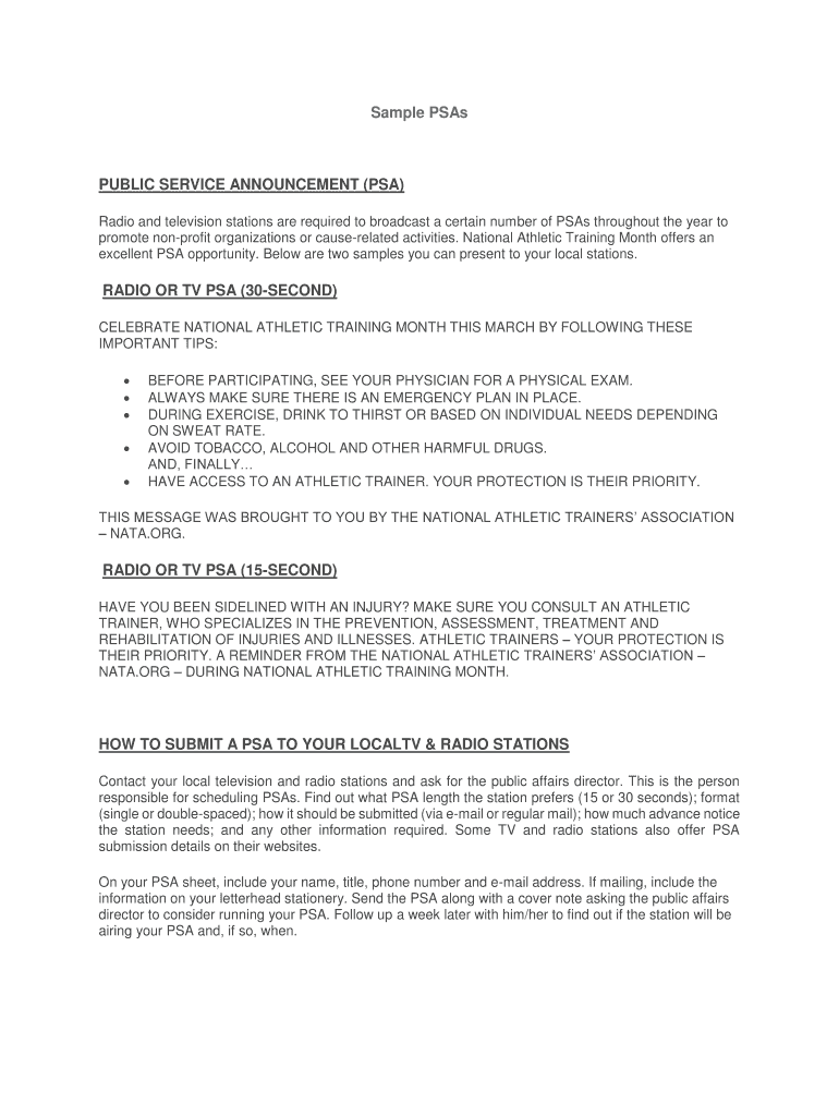 Sample PSAsPUBLIC SERVICE ANNOUNCEMENT (PSA) Radio and television stations are required to broadcast a certain number of SAS throughout the year to promote nonprofit organizations or cause related