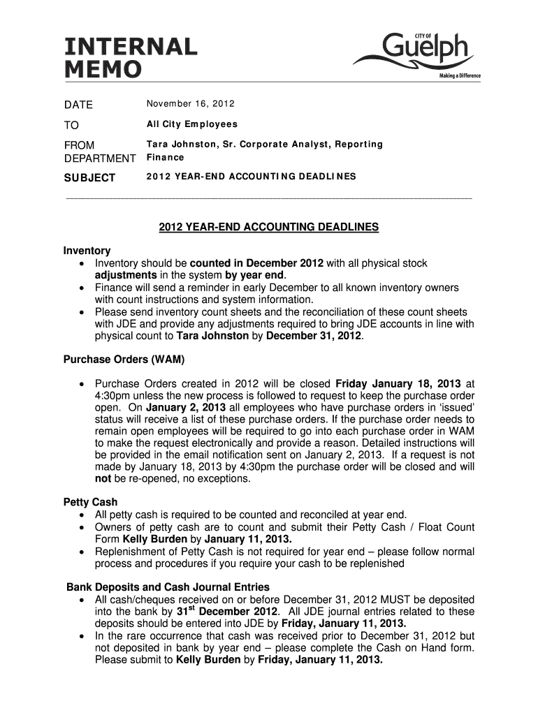 INTERNAL MEMO DATE November 16, 2012TOAll City Employees Tara Johnston, Sr. Corporate Analyst, Reporting FROM DEPARTMENT FinanceSUBJECT2012 YEAREND ACCOUNTING DEADLINES 2012 YEAREND ACCOUNTING DEADLINES