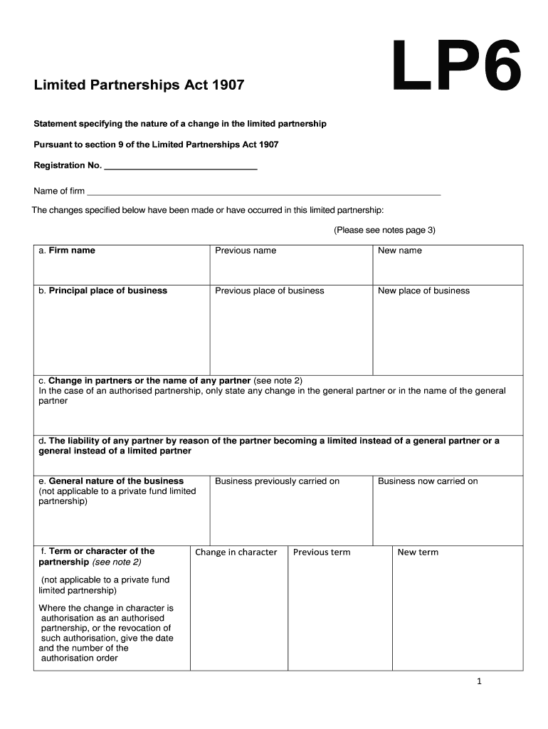 LP6Limited Partnerships Act 1907 Statement specifying the nature of a change in the limited partnership Pursuant to section 9 of the Limited Partnerships Act 1907 Registration No. Name of firm The