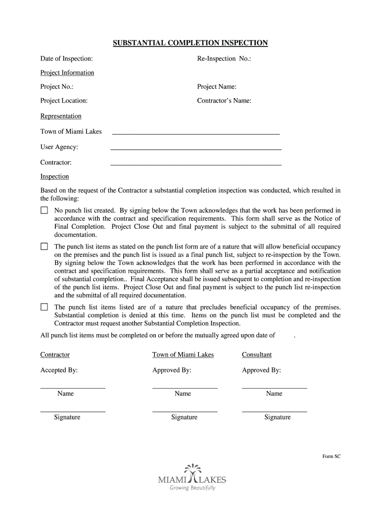 SUBSTANTIAL COMPLETION INSPECTION Date of Inspection:ReInspection No.:Project Information Project No.:Project Name:Project Location:Contractors Name:Representation Town of Miami Lakes User Agency: