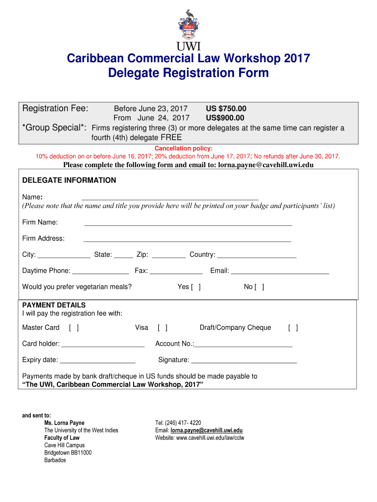 Caribbean Commercial Law Workshop 2017Delegate Registration Form Registration Fee:Before June 23, 2017, US $750.00 From June 24, 2017, US×900.00 *Group Special*: Firms registering three (3) or more
